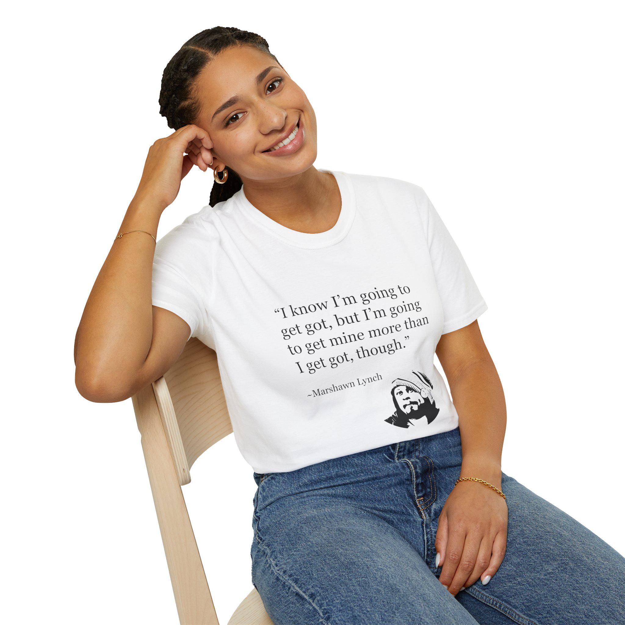 This shirt puts one of Marshawn Lynch’s most legendary quotes front and center: “I know I’m going to get mine more than I get got though.” It’s pure Beast Mode energy — confident, unbothered, and unapologetically real. Fans of football culture instantly recognize the line, and even people who don’t follow the game get the message loud and clear. It’s about knowing your value, staying ready, and betting on yourself every time.